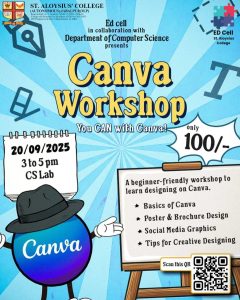 The Department of Computer Science, St. Aloysius’ College (Autonomous), Jabalpur (M.P.), organized a Canva Workshop for students on 20th September 2025 from 3:00 p.m. to 5:00 p.m. in the Computer Science Laboratory. The objective of the workshop was to introduce students to the fundamentals of creative designing using the Canva platform, enabling them to create visually appealing presentations, posters, and digital content with ease.
