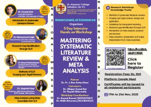 • The Department of Commerce, St. Aloysius’ College, successfully organized a 5-Day National Intensive Hands-on Workshop on “Mastering Systematic Literature Review (SLR) & Meta-Analysis” from 17th to 21st November 2025.