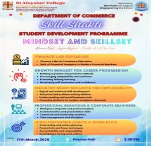 - Skill Shakti: Student Development Programme on Mindset and SkillsetThe Department of Commerce of St Aloysius’ College organized Skill Shakti, a Student Development Programme on “Mindset and Skillset” on 17th March 2026 at Prerna Hall at 3:00PM .